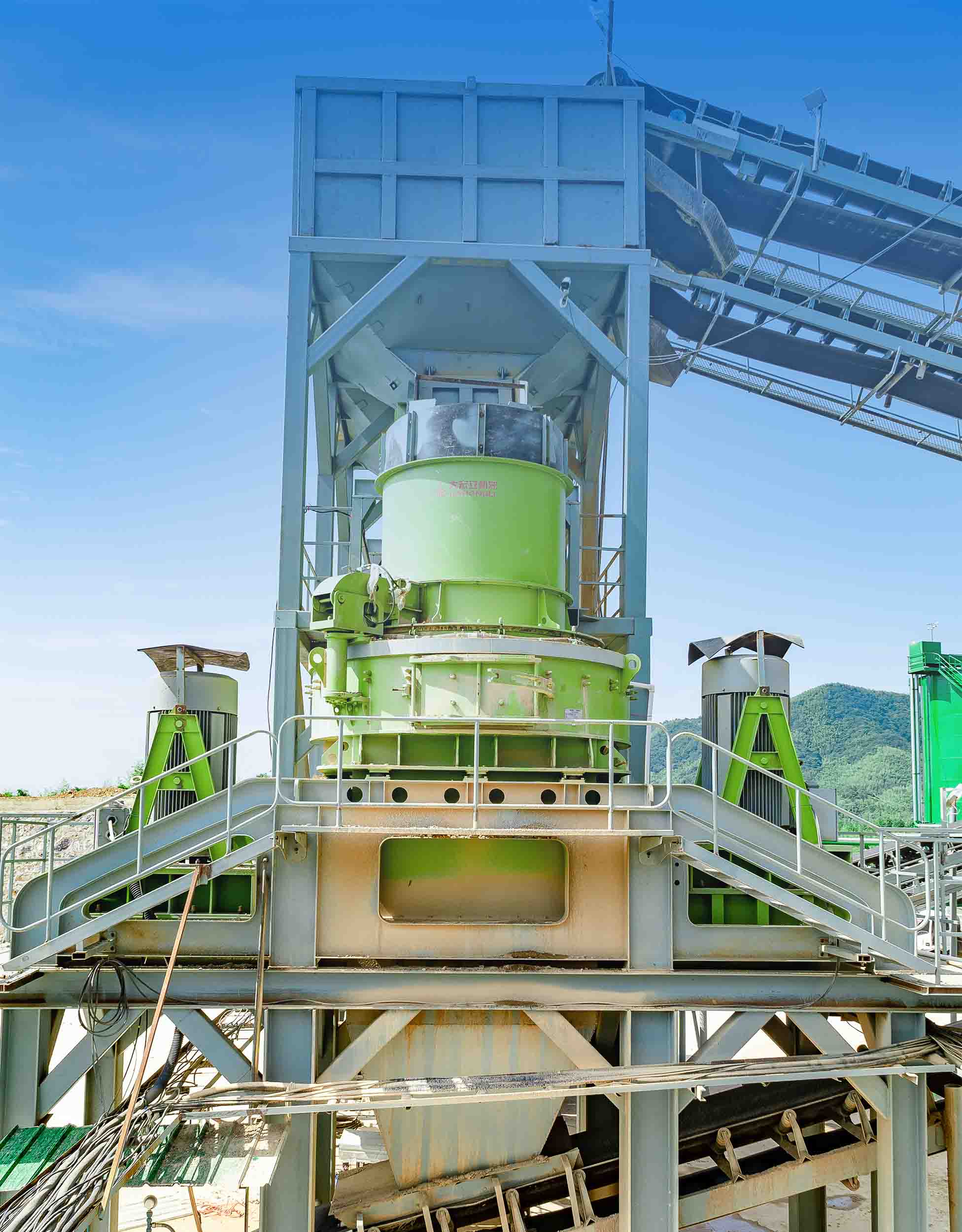 此條生產線以大鄂破機、單缸液壓圓錐破碎機、沖擊破制砂機、對輥機(高壓輥磨機)等主機為核心,采用全自動中央控制系統,動態調整成品砂石比例,甚至可實現全制砂生產